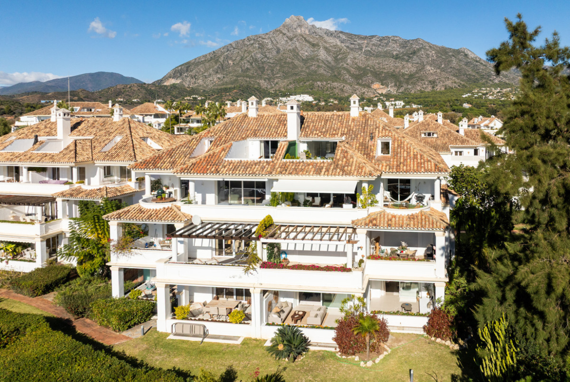The property features 169 m² of built space complemented by a 41 m² private terrace, with direct access to beautifully maintained communal gardens and swimming pool, creating a seamless indoor-outdoor living experience.