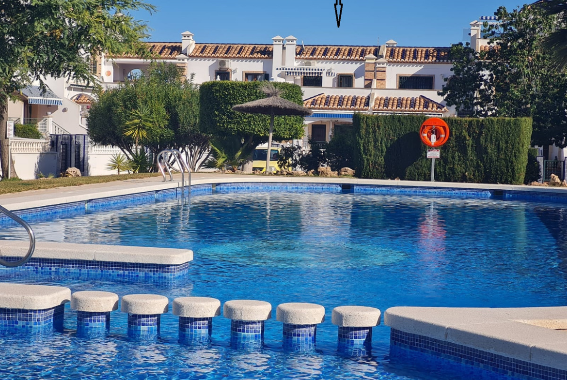 We are delighted to offer for sale this superb 100m2 south-west facing Bungalow Buhardilla in the very sought after urbanisation of VILLAMARTIN Pau-8. The property is situated in a gated urbanisation and offers 3 bedrooms, 2 bathrooms with 68m4 front and rear gardens. Entering through the 8m2 sunny terrace the property distributes as; spacious open plan lounge, dining area and fully equipped kitchen, complete with an adjacent utility/storage area. On this level you have two double-sized bedrooms with fitted wardrobes and a bathroom with shower, one of the bedrooms has patio doors leading out to the rear 14m2 garden. To the first floor you find a further double bedroom with ensuite bathroom with 2 wash basins and shower, a large storage room and patio doors leading out to the sunny 27m2 solarium with lovely open green area and pool views. This lovely property is sold unfurnished and has air-conditioning and internet. The wonderful gated community is very well maintained and gives peace of mind. It has 1 large communal swimming pool, nice communal gardens, parking in front of the house and is only 10 min walking distance to the famous Villamartin Plaza, Golf Course and supermarket, within 5 min drive you find the largest shopping centre in the Alicante region, Zenia Boulevard with over 150 shops, bars and restaurants. The white sandy beaches of Orihuela Costa are only 3 km away and 45 mins drive from both Alicante and Murcia Corvera Airports. This lovely property will not be on the market long, so early viewing is advised to avoid disappointment. MUST BE SEEN !!