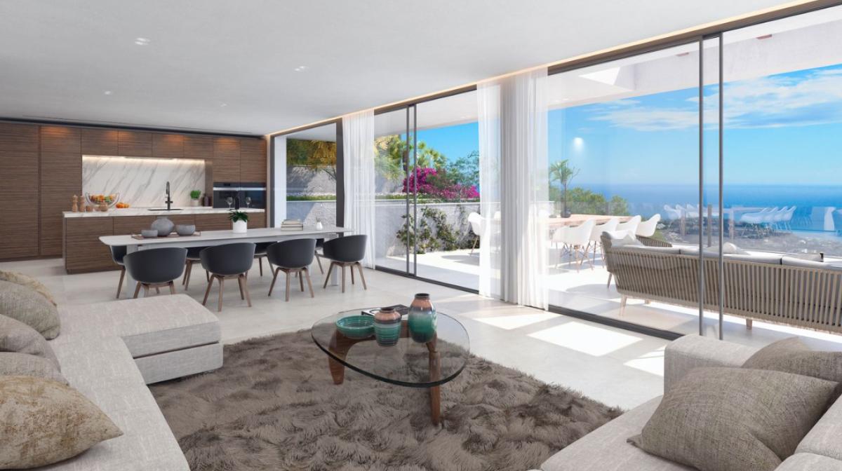 The sliding doors of the living room connect directly to a spectacular terrace conceived as a natural extension of the interior, perfect for enjoying the Mediterranean climate, social gatherings, or moments of relaxation outdoors.