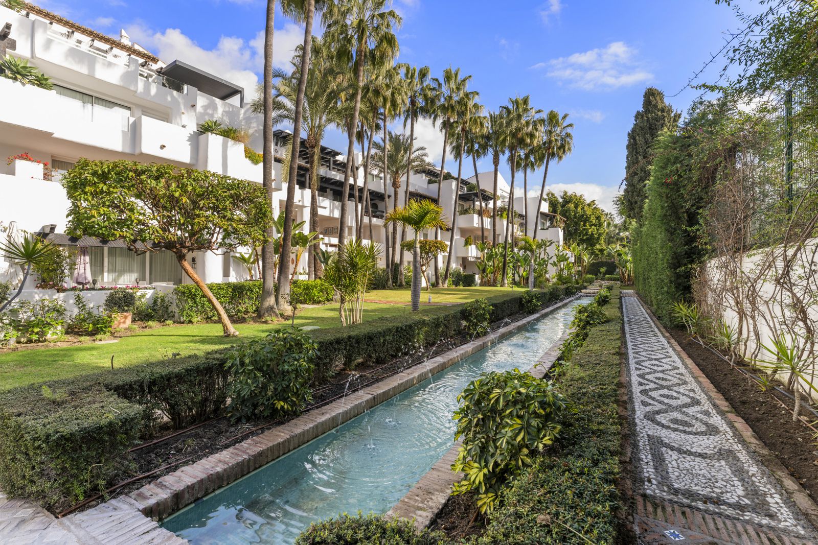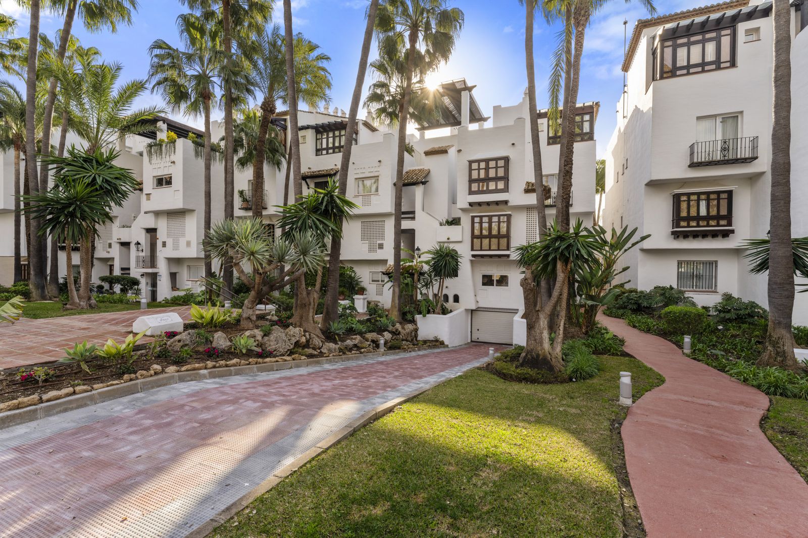 Ubicado en la prestigiosa zona de Puente Romano, este exquisito apartamento de tres dormitorios ofrece una sofisticada combinación de confort y elegancia en una de las ubicaciones más codiciadas de Marbella. A poca distancia de reconocidos restaurantes gourmet, boutiques de lujo y las playas de la Milla de Oro, el apartamento goza de una ubicación privilegiada. Al entrar, le recibe un amplio diseño de planta abierta que conecta perfectamente la cocina moderna con el comedor y el acogedor salón. Este diseño pensado realza la sensación de amplitud y luz natural, creando un ambiente ideal tanto para relajarse como para entretener. El espacio de estar se extiende hacia una terraza privada con vistas a los jardines comunitarios perfectamente cuidados, un lugar ideal para desconectar y disfrutar del entorno tranquilo. Los residentes también disfrutan del acceso a la piscina comunitaria y a las zonas ajardinadas, lo que aumenta aún más el atractivo de este entorno sereno. Cada uno de los tres dormitorios es en suite, lo que garantiza privacidad y confort a todos los residentes. La suite principal destaca por su propia terraza privada, que ofrece un refugio tranquilo con vistas agradables y acceso directo al exterior. Combinando una ubicación privilegiada, interiores refinados y servicios comunitarios de alta calidad, este apartamento en Puente Romano representa una oportunidad excepcional para disfrutar de lo mejor de la vida costera en Marbella.