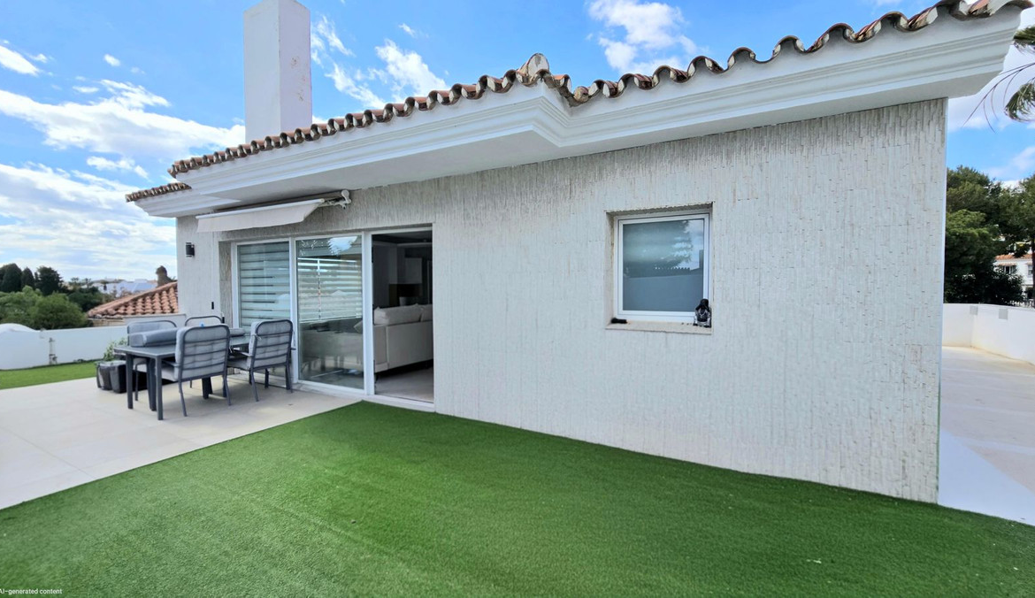 This property is an independant villa with a clever conversion. Fully reformed 2 bed 2 bath apartment with sea views on the properties first level. Enter the property to a large outside wrap around terrace area, great for relaxing with seating areas. Enter the apartment and you are met with a bright Tastefully renovated space with sea views from a large deliberatly designed double glazed window, good sized living area with open plan kitchen, modern appliances, good sized uttility area, uniformed flooring through out.
