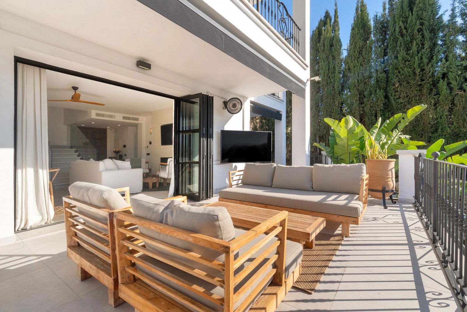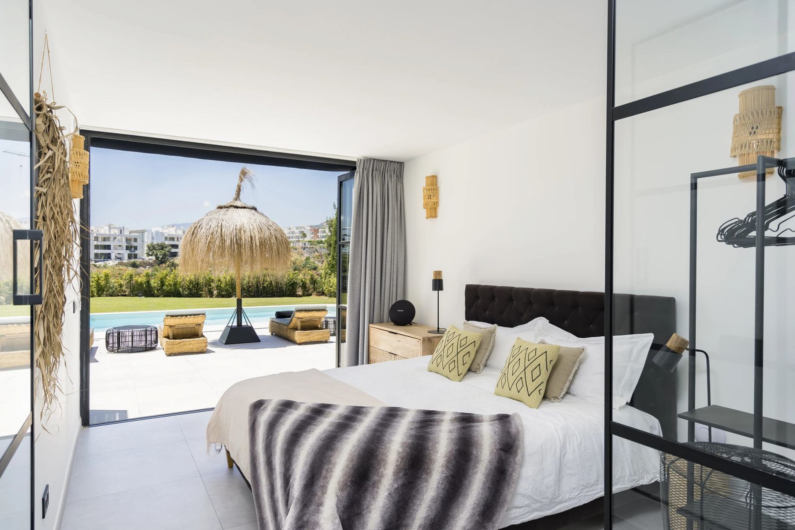 This exquisite six-bedroom villa, is located within the exclusive gated community of Puerto Del Capitán, perfectly situated just minutes from the sought-after areas of Benahavis, Marbella, and Puerto Banus. Offering a privileged location at the end of a peaceful cul-de-sac, the villa ensures added privacy and tranquillity. It provides easy access to world-class amenities, luxurious dining experiences, designer shopping districts, and some of the Costa del Sol’s most prestigious golf courses, including Los Arqueros, La Quinta, El Higueral, Guadalmina, and Los Naranjos. For golf enthusiasts, this is a dream location, combining convenience with breathtaking views of the surrounding landscape. Adding to the allure of the neighbourhood, the community features a guard on duty daily from 7 PM to 7 AM, offering residents exceptional security and peace of mind. Originally built in 2005, villa has recently undergone a complete transformation, refurbished to the highest luxury standards. It is a stunning showcase of contemporary design with a touch of timeless Andalusian charm. The property sits within a meticulously designed tropical garden, featuring lush greenery and vibrant plants that create a serene and private oasis. The outdoor spaces have been completely upgraded, with brand-new Italian porcelain terraces that provide stylish yet practical spaces for lounging or dining al fresco. Step into the villa and experience a bright, open-plan space that radiates modern sophistication. Inspired by Scandinavian minimalism, the design flawlessly combines neutral tones, elegant glass accents, and thoughtfully curated lighting. On the main entrance floor, contemporary living takes center stage. A spacious living and dining area seamlessly transitions into a sleek black kitchen, complete with premium appliances, custom cabinetry, and exquisite finishes. Additionally, an ensuite guest bedroom awaits, featuring its own private terrace with stunning views of the pool and surrounding mountains. On the upper floor, the grand master suite is a true sanctuary. With its vaulted ceiling, the room feels airy and luxurious, while the private terrace offers sweeping views of the pool and gardens below. The master suite is carefully designed to balance style and comfort, with a spacious layout and a luxurious en-suite bathroom. Adjacent to the master suite, another generously sized bedroom, complete with its own bathroom and terrace, provides a calm retreat for guests or family members. The lower level of villa offers even more space to enjoy, with three additional bedrooms and a versatile area that can be used as a second living room or entertainment zone. This level opens directly to the outdoor spaces, allowing for a seamless indoor-outdoor living experience. Whether you’re heading to the heated pool for a refreshing swim or relaxing in the jacuzzi, this connection to the outdoors enhances the home’s overall appeal. This exclusive villa is move-in ready, sold fully furnished with carefully selected chic Scandinavian-inspired decor, all appliances, and even utensils. Every room is thoughtfully curated to blend practicality with luxurious styling. As an added bonus, the property includes a fully equipped gym tucked away within the garden. Featuring advanced Technogym equipment, it offers a private space to maintain your fitness routine while surrounded by the beauty of the outdoors. Every detail of villa has been thoughtfully crafted to ensure a luxurious and comfortable lifestyle. The newly renovated kitchen and bathrooms are furnished with premium materials and modern finishes, while custom wardrobes and doors add a touch of elegance throughout the home. Engineered wood flooring lends warmth and texture to the interiors, complemented by a modern electrical and LED lighting system that enhances the ambiance. A state-of-the-art heat and air conditioning system ensures year-round comfort, regardless of the season. With its refined finishes, unparalleled location, southwest orientation that lets you enjoy stunning sunsets every evening, and exceptional amenities, this villa is more than just a home—it’s a masterpiece. Whether you’re seeking a tranquil retreat, a family home, or the perfect space to host and entertain, this villa offers the perfect blend of elegance, functionality, and charm. It’s a property that invites you to savour the very best of the Mediterranean lifestyle, making every day feel like a luxurious getaway.