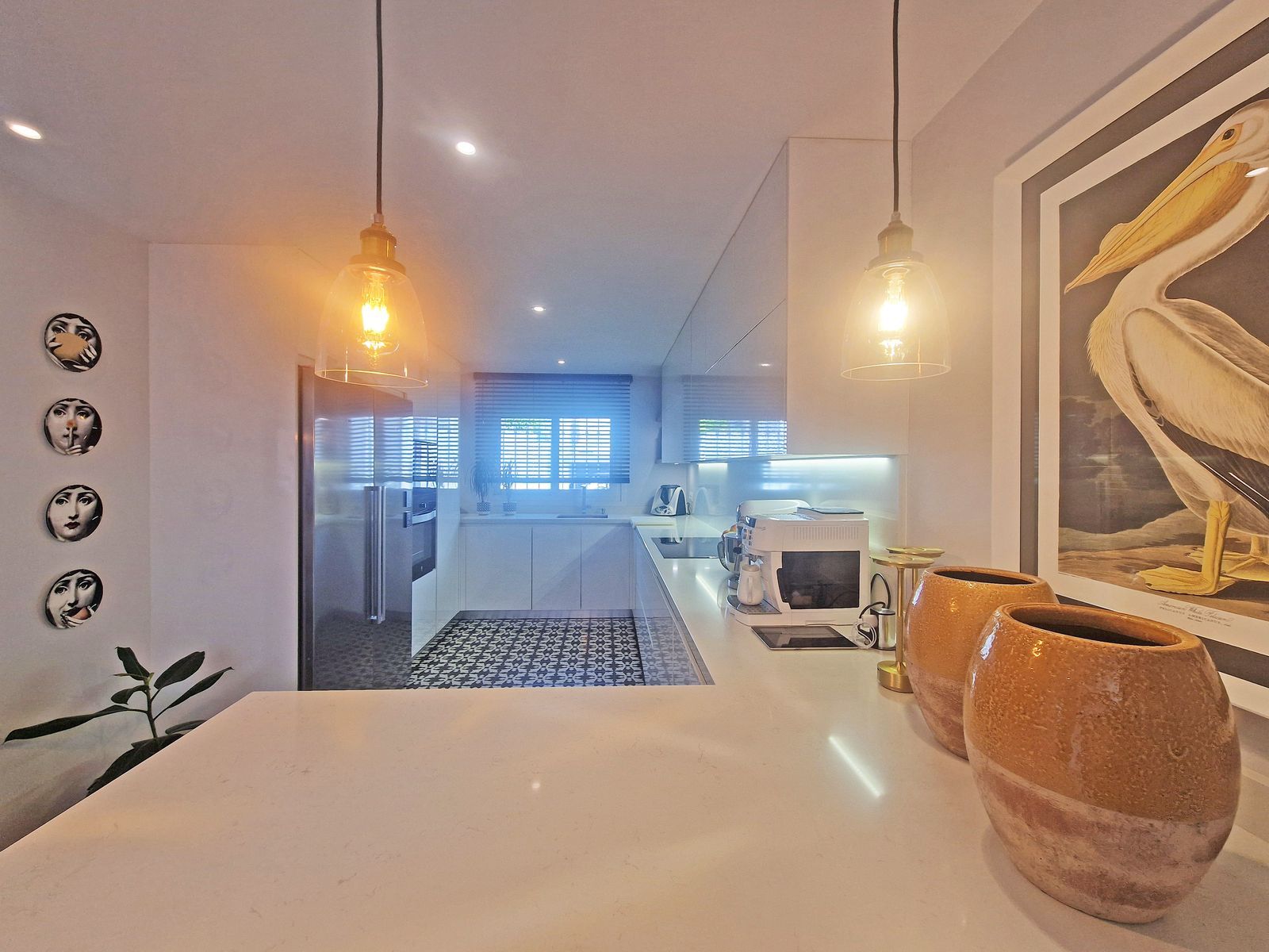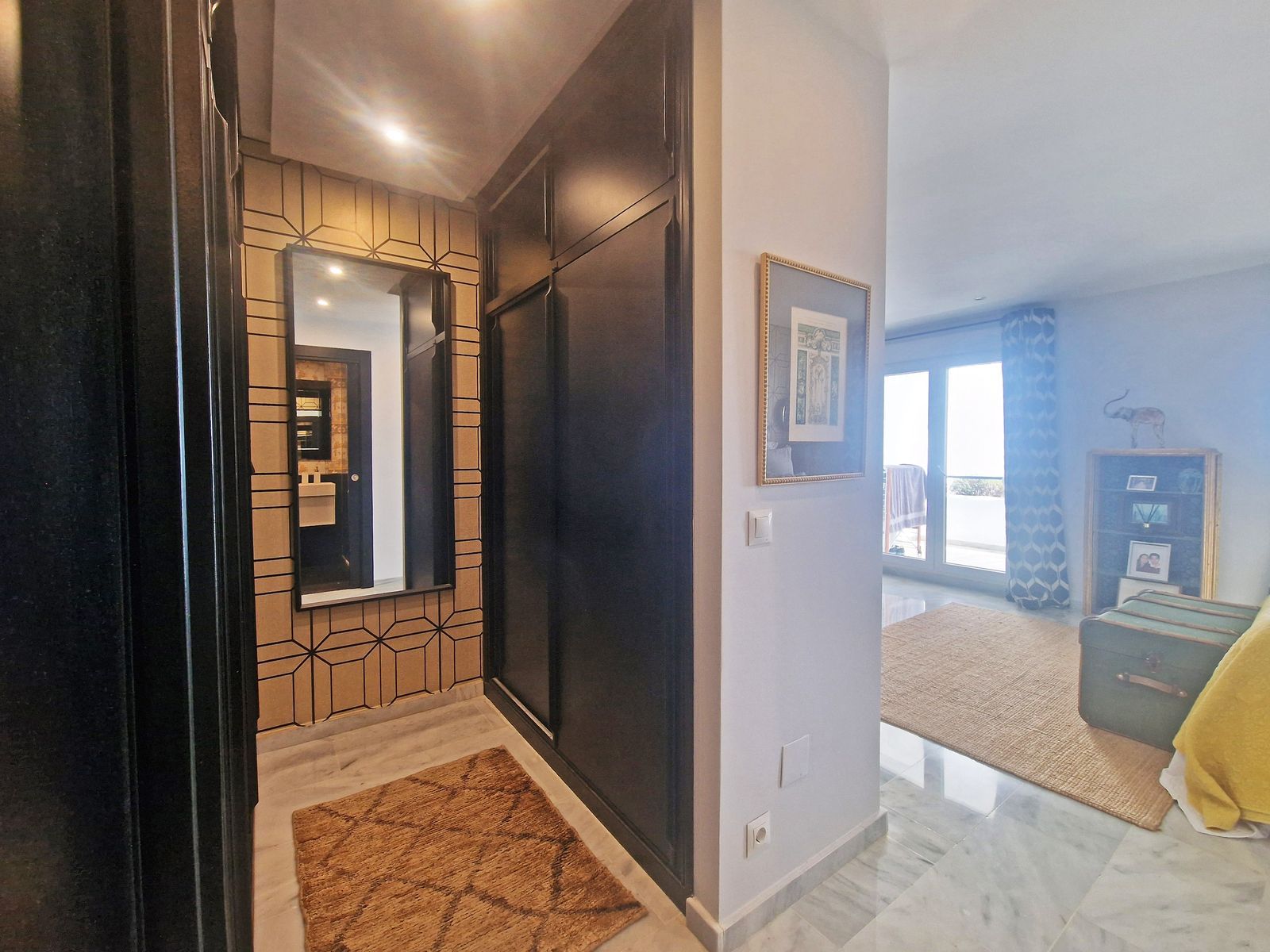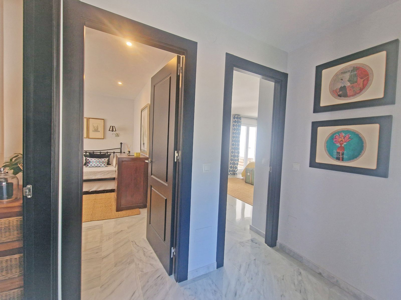 An Exceptional Property in Calahonda with Breathtaking Views and Impeccable Design This beautifully renovated property in Calahonda is truly one-of-a-kind, offering panoramic views of the sea, golf course, and mountains. Thoughtfully restored with exquisite taste and meticulous attention to detail, this home blends elegance, comfort, and functionality in a way that is rarely found on the market. The main house features two spacious bedrooms, including a luxurious master suite that was originally two separate rooms. This exceptional suite boasts a walk-in dressing room and access to a private terrace with spectacular open views—perfect for soaking in the beauty of the Costa del Sol. The open-plan living and dining area, complete with a cozy fireplace, flows seamlessly into a stunning glazed terrace facing south. Thanks to elegant folding patio doors, the interior merges effortlessly with the beautifully landscaped garden, creating a refined indoor-outdoor lifestyle ideal for year-round enjoyment. The kitchen has been completely modernized and opens onto the dining area, making it an integral and inviting part of the living space. A stylish guest toilet adds further convenience on this level. Below the main house, the independent guest apartment offers fantastic flexibility. This semi-basement level includes a comfortable sitting room, a modern shared bathroom, two bedrooms (one without a window), and a spacious storage room. There is also potential to add a fifth bedroom by converting the attic, making this property perfect for growing families or hosting guests. Additional features include air conditioning in all rooms, a private parking space right at the entrance, and the option to park a second vehicle inside the gated community. The secure urbanization also offers a large communal swimming pool and 28.000 m² of beautifully maintained gardens. Perfectly located just 15 minutes from both Marbella and Fuengirola (with its convenient train station), and only 25 minutes from Málaga International Airport, this home offers peaceful living without sacrificing connectivity. Calahonda provides all the amenities needed for comfortable year-round living or unforgettable holidays—beaches, restaurants, shops, supermarkets, and more are all just minutes away. Properties of this quality and character are extremely rare—this is a unique opportunity to own a truly remarkable home in one of the Costa del Sol’s most desirable locations.