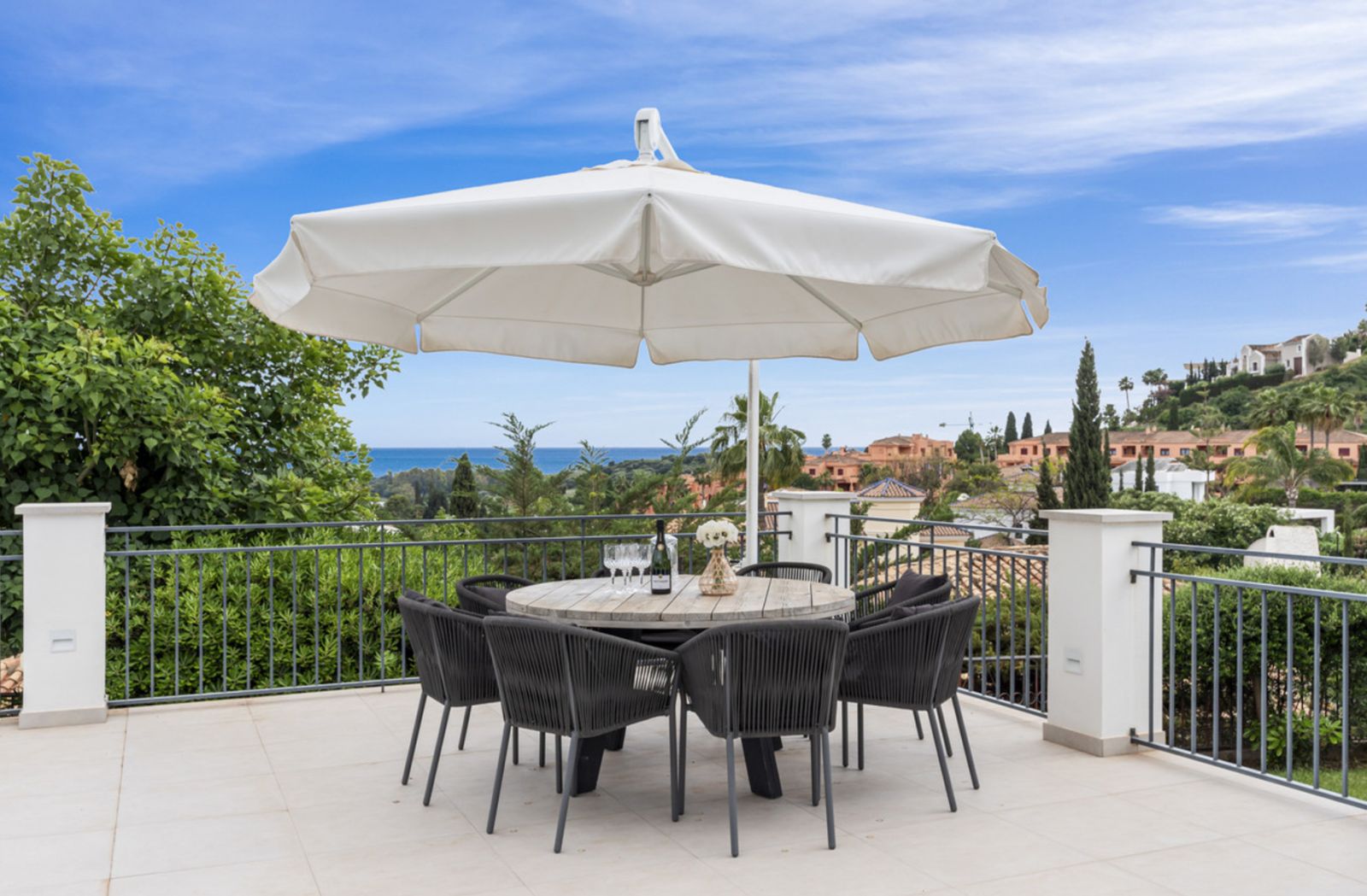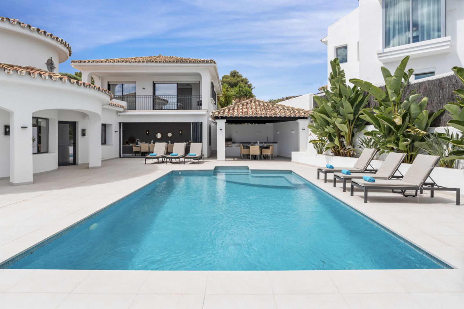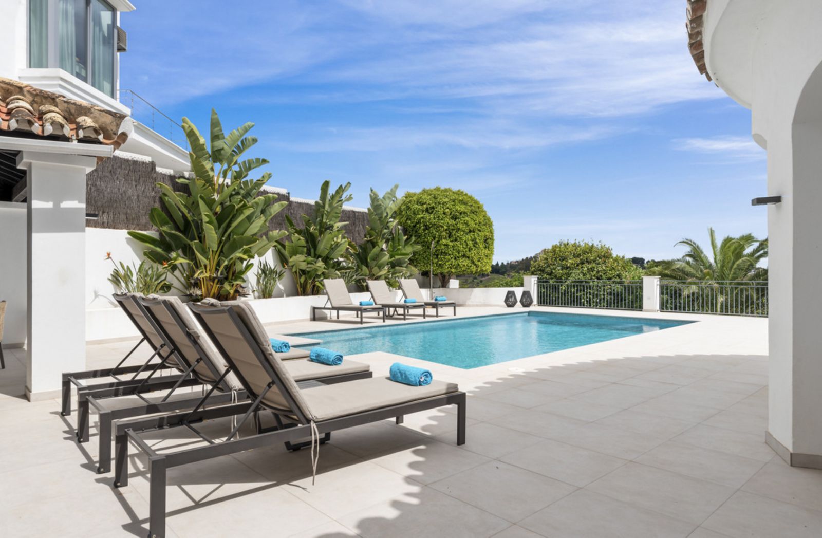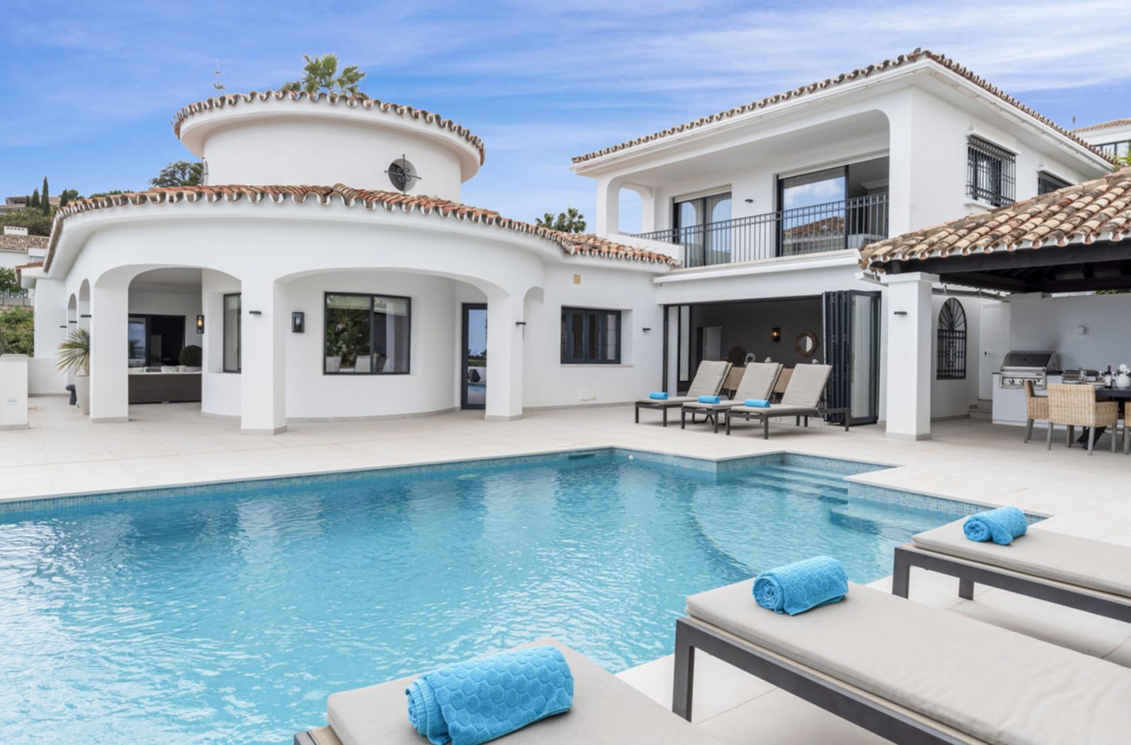 This Andalusian-style villa, fully renovated to the highest standards, combines authenticity with modern elegance. Ideally located in the enclave of El Paraíso Alto, Benahavís, the home offers breathtaking panoramic sea and golf views, while being just minutes from Marbella, Puerto Banús, and Estepona. Set on a 1,308m² plot, the property features 457m² of family living space and a 200m² terrace with sweeping views. The villa comprises five spacious bedrooms and five bathrooms, including three on the main floor and two upstairs with private terraces and expansive vistas. Outdoor living is equally impressive, with a large private pool, mature gardens, chill-out areas, a covered terrace, and an integrated barbecue kitchen for alfresco dining. A two-car garage, basement space, alarm system, and 24-hour security further enhance convenience and peace of mind. The villa enjoys a prime location surrounded by world-class golf courses, prestigious international schools, and supermarkets, making it an exceptional choice for families. With its tourist license and LPO in place, the property has already proven itself as a high-demand holiday rental, also offering strong investment potential.