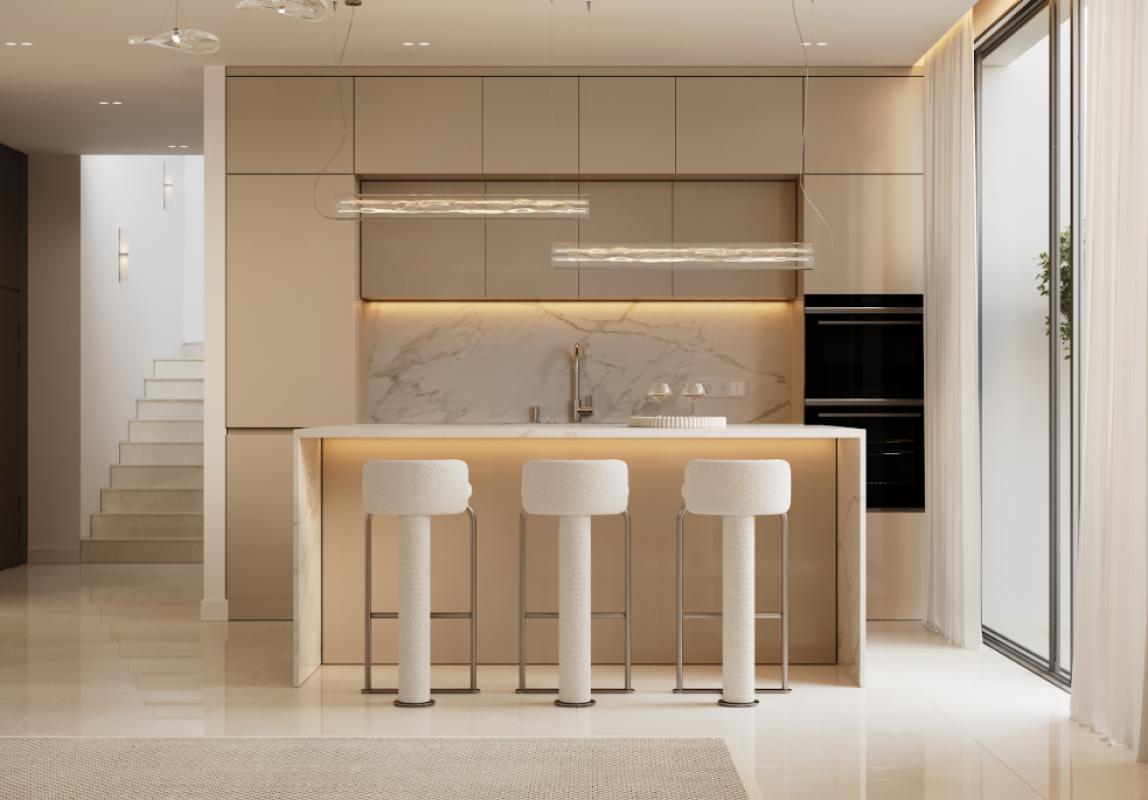 The interiors of these homes have been carefully crafted to provide spacious, bright spaces connected to the outside. The living-dining area merges with a kitchen equipped with high-end appliances, creating an elegant and functional environment. Large windows and sliding doors maximise the influx of natural light, allowing the views to accompany every moment.
