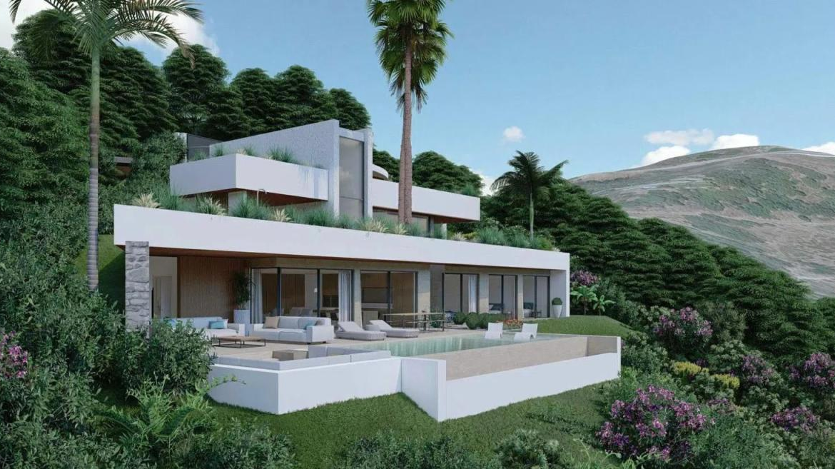 Real estate in Villa Macarena: Experience luxury in this contemporary three-level villa nestled amid picturesque hills. Enjoy panoramic views of the sea and nature within a secure, gated community offering 24-hour security and surveillance cameras.