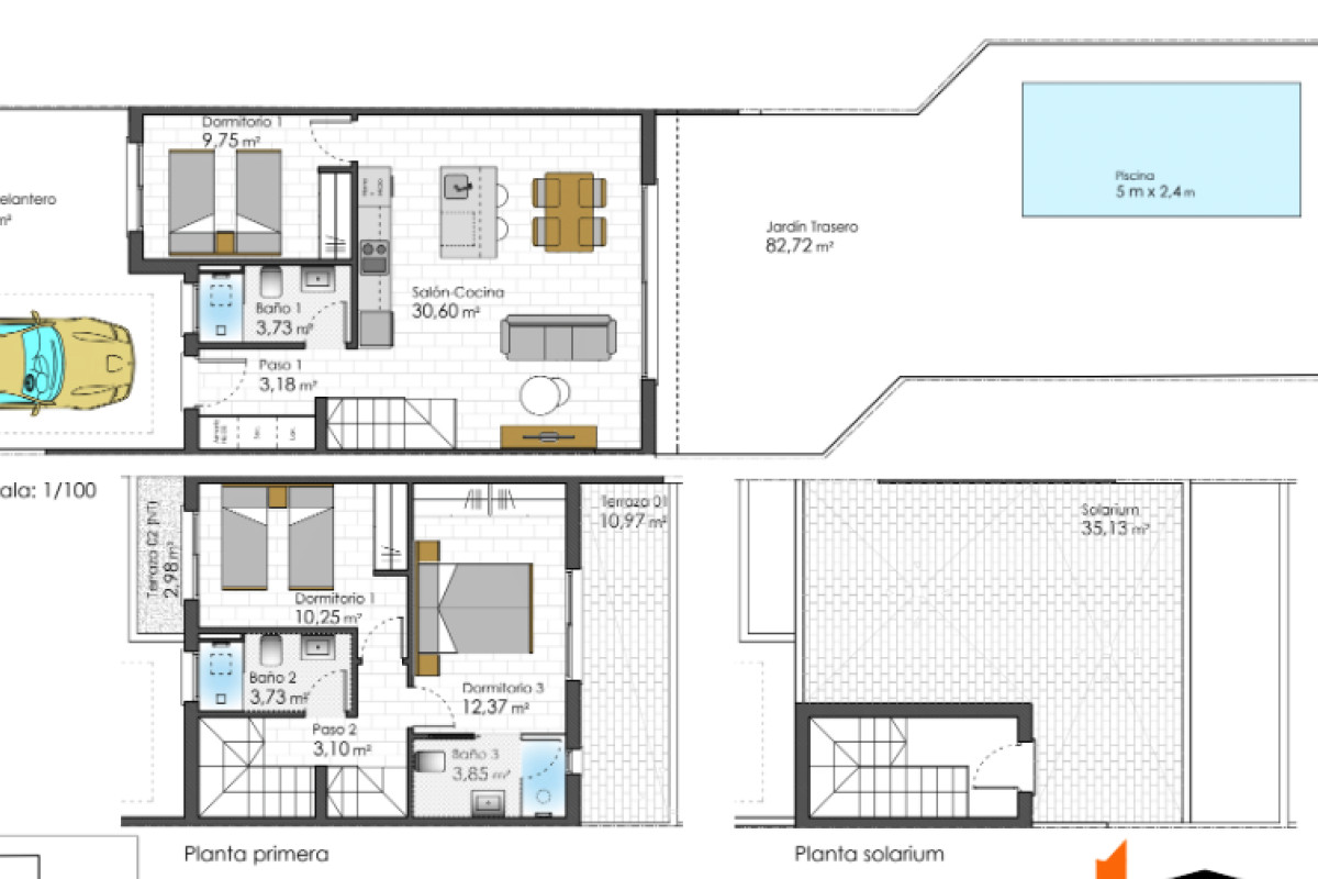 We are delighted to present these stunning villas located just a minute’s walk from the serene beaches of the Mar Menor in the charming area known as Complex. Each villa offers a modern living experience with three spacious bedrooms and three bathrooms, complemented by a private solarium and pool. The properties are thoughtfully designed over two levels, maximizing the use of the plots.