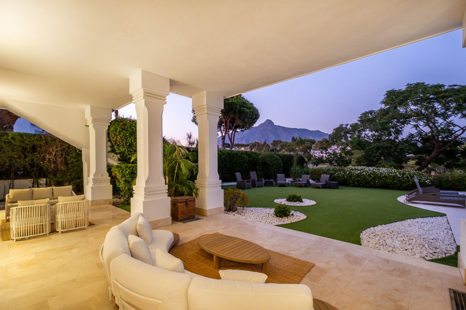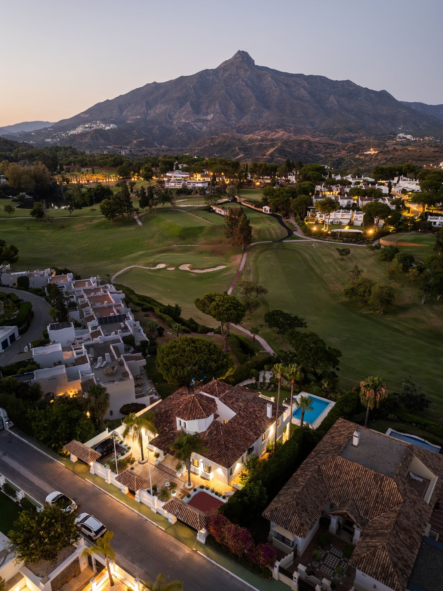 Stunning frontline golf villa with panoramic mountain views to La Concha as well as overlooking the beautiful Aloha Golf course. The Villa is situated on a quiet cul-de-sac, just a short distance to the famous Puerto Banús marina and Aloha Gardens. The property is extremely convenient in terms of the floor plan distribution. All the main social areas such as kitchen, living room, dining room are well connected with direct accesses outside to the beautiful outdoor space that gives you a generous amount of natural sunshine throughout the home. All bedrooms are extremely good size with en suite bathrooms. All the bedrooms on the lower part of the house also have direct accesses to the gardens and pool area. This is an incredible opportunity to acquire an elegant high standard Andalusian villa in the most prime location of Nueva Andalucia with walking distance to all the amenities. This home is an ideal permanent or holiday home, don't miss this one of a kind