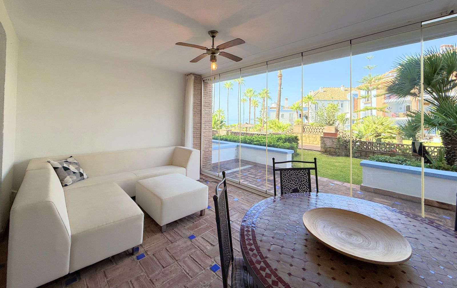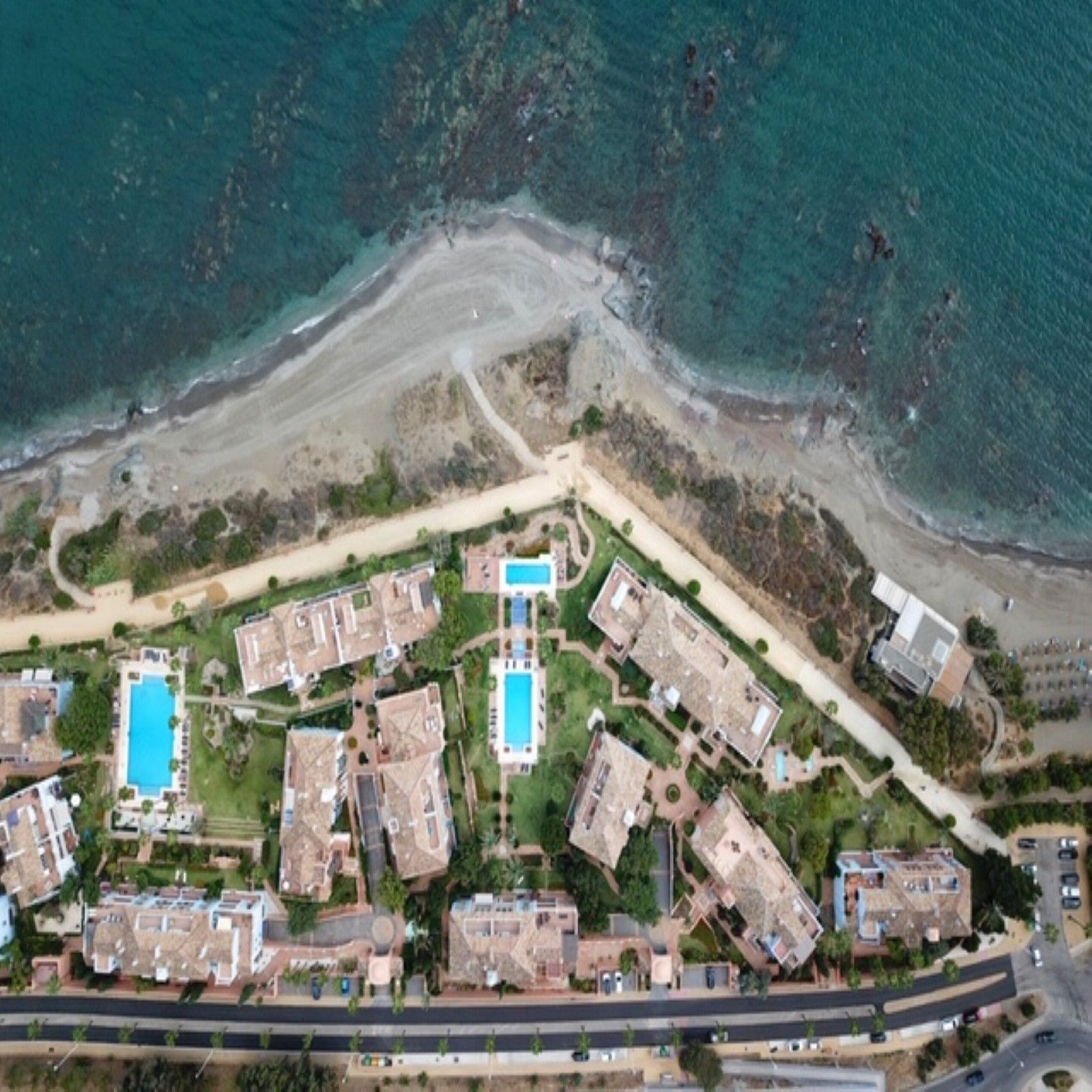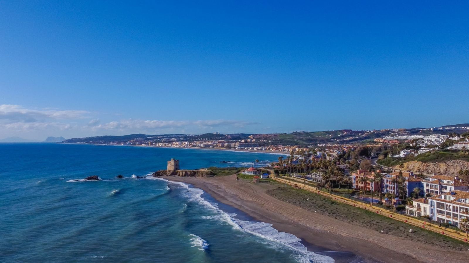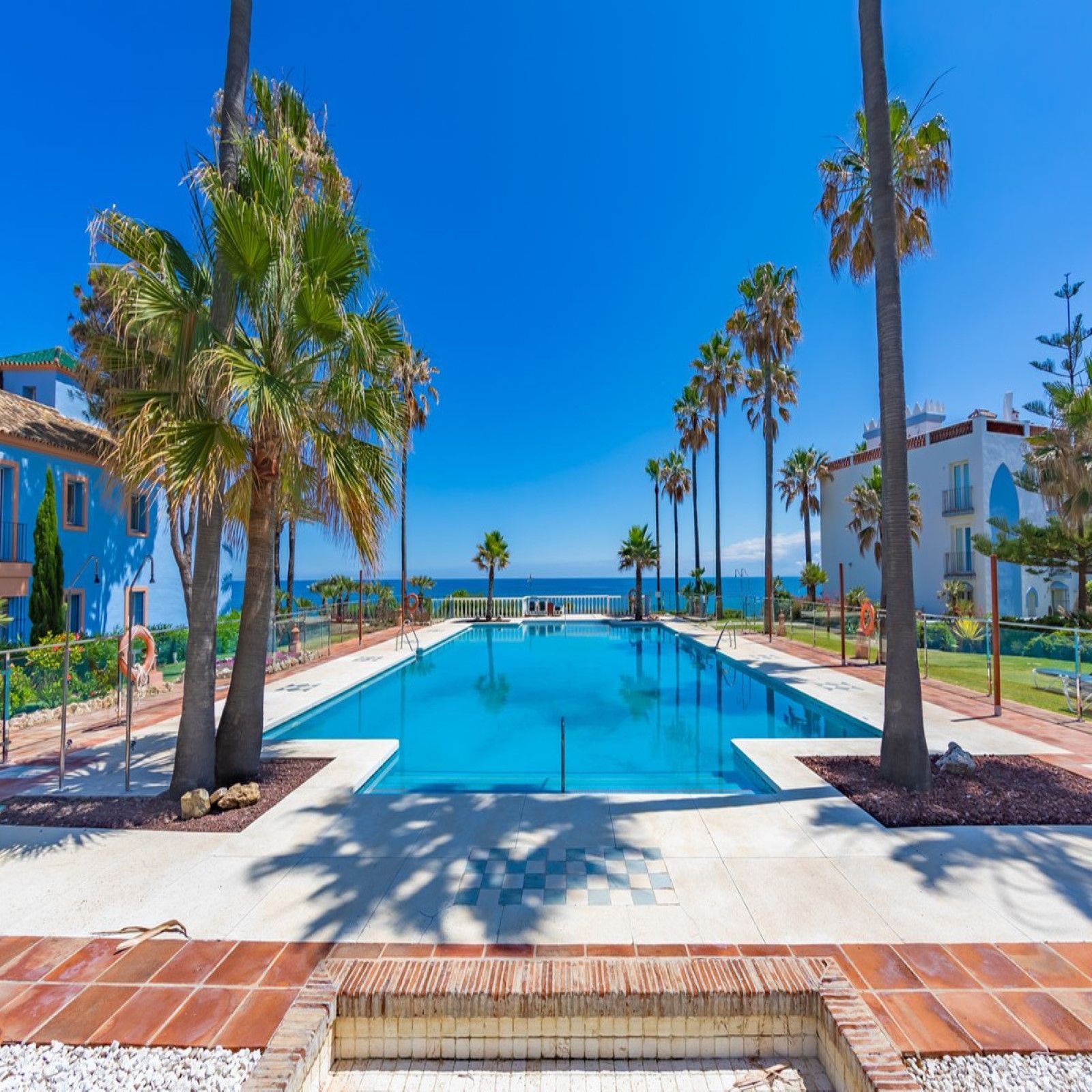 NEW TO THE MARKET: IMPRESSIVE FIRST-LINE BEACH APARTMENT, GROUND FLOOR, CORNER UNIT, with a PRIVATE GARDEN perfectly maintained by the community, offering SPECTACULAR VIEWS OF THE SEA, THE BEACH, GIBRALTAR, AND AFRICA. Located in the beautiful Bay of Casares, next to a protected historical area with an ancient Arab tower, within the stunning La Perla de la Bahía complex, beautifully designed by fusing Andalusian and Arab styles. Surrounded by lush gardens, magnificent pools (2 heated), a wide variety of decorative fountains, and relaxation areas designed for ultimate enjoyment. Only a 2-minute walk to 3 different beaches, 2 renowned restaurants, and the prestigious Finca Cortesín golf resort, which is awarded every year as the Best Golf Resort in Spain, is ranked among the 50 best golf courses in the world, and hosted the prestigious Solheim Cup competition in 2023, among others. Strategically located between Estepona and the charming Puerto de la Duquesa and the village of Sabinillas, all just a 5-minute drive away, offering access to a wide range of shops, restaurants, leisure activities, and different golf courses. The gated community offers 24-hour security and video surveillance, ensuring peace of mind and safety. This property includes 2 parking spaces in a garage and 1 large storage room. All of this makes it not only a dream residence but also an outstanding investment opportunity with high rental potential. A unique property that must be seen!