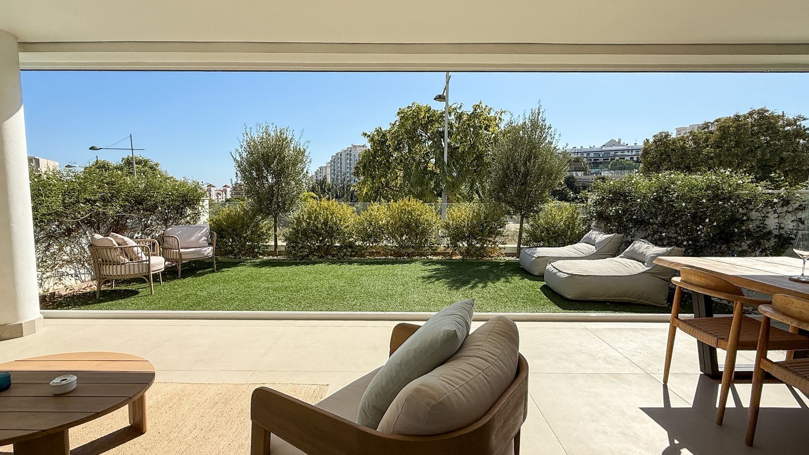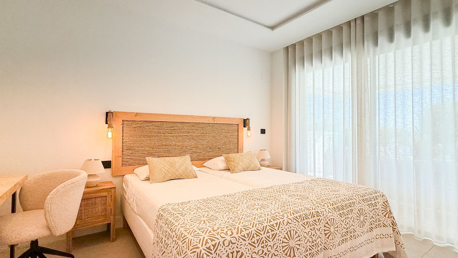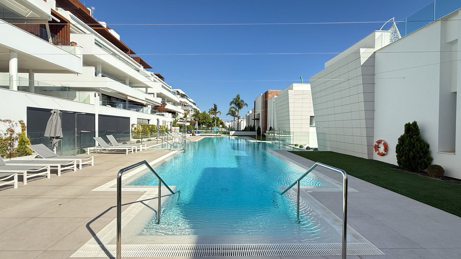 Fantastic luxury apartment located in the centre of Estepona, the garden of the Costa del Sol. This newly build apartment is conveniently situated within walking distance of the marina of Estepona , close to the romantic and vibrant old town and only 15 minutes walk from the beach of La Rada. Offering 2 bedrooms and 2 bathrooms. The main bedroom has an open plan bathroom with walk-in shower, anti-fog mirrors, electric towel racks and extra wardrobes. A fully equipped and open plan kitchen with all Bosch appliances and spacious living dining area. Carefully decorated in a perfect blend of Scandinavian minimalism, boho accents and ethnic touches. But more than that, it is the ideal place for outdoor living as there is also an oversized covered terrace that has been recently upgraded with glass curtains for maximum use of the terrace all year round and a very nice mediterranean garden with very low maintenance. The terrace has water and electricity pre-installation for an outdoor kitchen. The garden has sprinkler installation for automatic watering of the plants as wel as pre-installation for a jacuzzi. The domotic system for home automation is also installed to control the lights and electric blinds. Air conditioning and floor heating are provided though aerothermal energy. Also good to know is that the extra spacious utility room with washing and tumble dryer is just across the front door. A private underground parking space is also included in the price. The exclusive gated community offers a large outdoor pool and state of the art gym facilities, community area, game room and secure entrance. Alexia Life stands out for its architecture and design but also for the great community and is a must see if you are looking for the perfect holiday house or for all year round living.