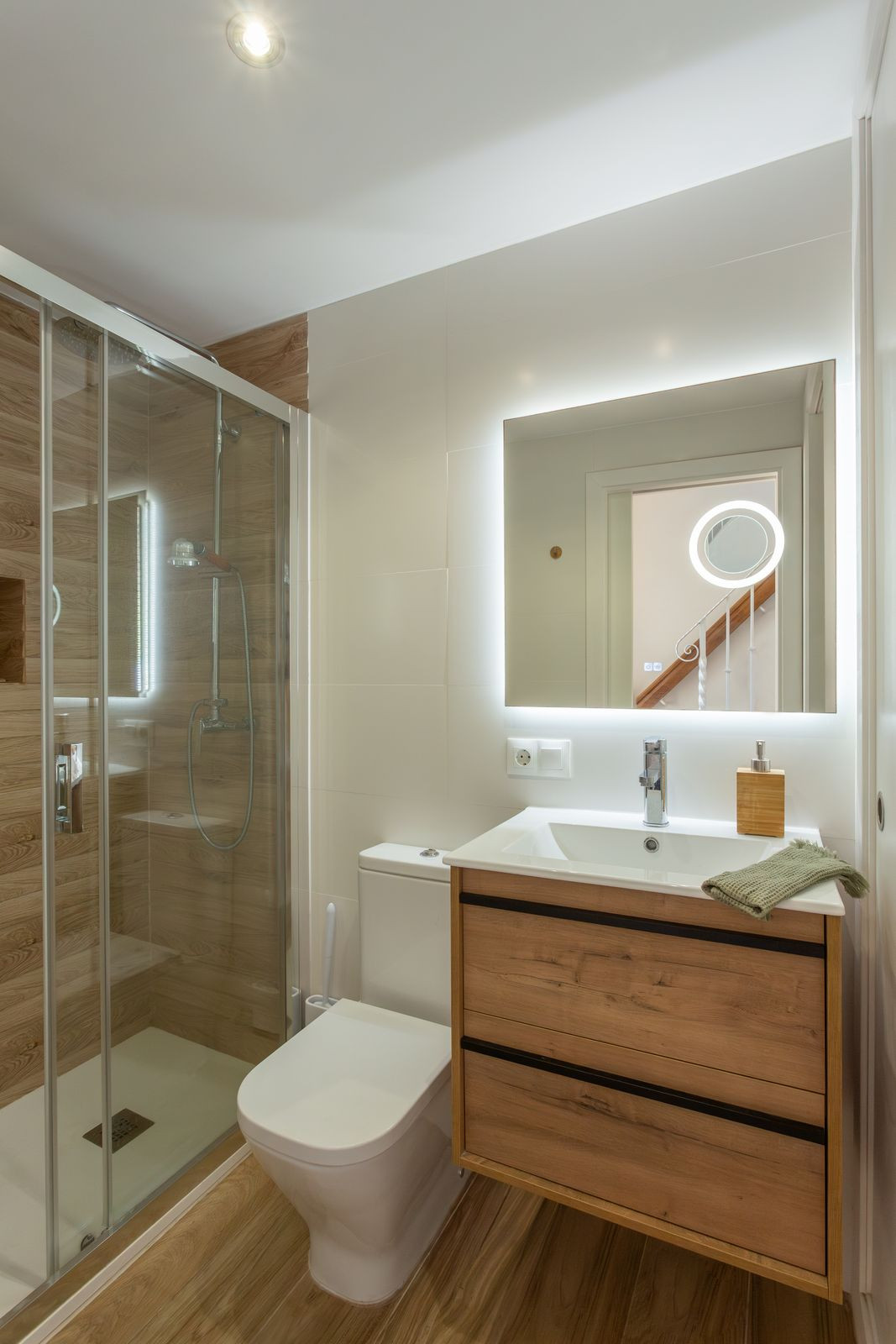 On the ground floor we have the fully renovated bathroom with shower and the bedroom as well as beautiful back terrace.
