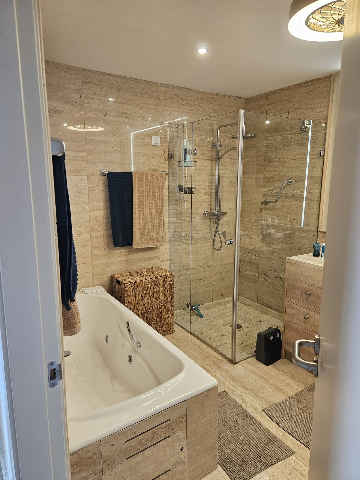 The flat features 2 spacious bedrooms, each with an ensuite bathroom for maximum privacy and comfort. The master bedroom is equipped with large fitted wardrobes and has both a front and rear terrace – ideal for enjoying the sun at any time of day. The guest bedroom also features a practical built-in wardrobe.