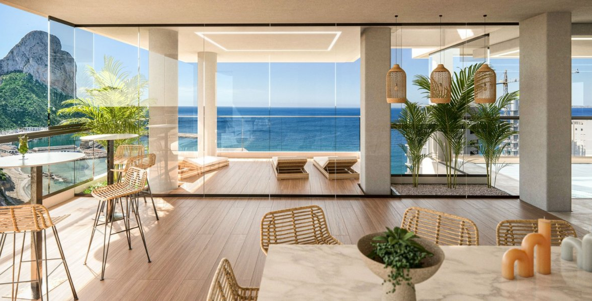 NEW BUILD APARTMENTS WITH THE SEA VIEWS IN CALPE New Build residential complex of 1, 2 and 3 bedrooms apartments with large terraces in Calpe. Two towers of 18 floors with beautiful apartments with views of the sea and the salt lake of Calpe. Complete installation of ducted air conditioning, with pump of cold and heat, by aerothermal control thermostat in living room. Large common areas with gardens, swimming pool, paddle tennis, children’s area. On 11th floor of tower 1: infinity pool, sauna, gym and chill area out with sea views. Calpe, one of the towns of La Marina Alta, lies on the northern coast of the province of Alicante, surrounded by the towns of Altea, Benidorm, Teulada-Moraira, Benissa. Calpe has a wonderful mixture of old Valencian culture and modern tourist facilities. It is a great base from which to explore the local area or enjoy the many local beaches. Calpe alone has three of the most beautiful sandy beaches on the coast. Calpe also has two Sailing Clubs: Real Club Náutico de Calpe and Club Náutico de Puerto Blanco. Fishing village of Calpe now transformed into a tourist magnet, the town sits in an ideal location, easily accessed by the A7 motorway and the N332 that runs from Valencia to Alicante; its approximately 1 hour drive from the airport at Alicante and 1,5 hours to Valencias airport.