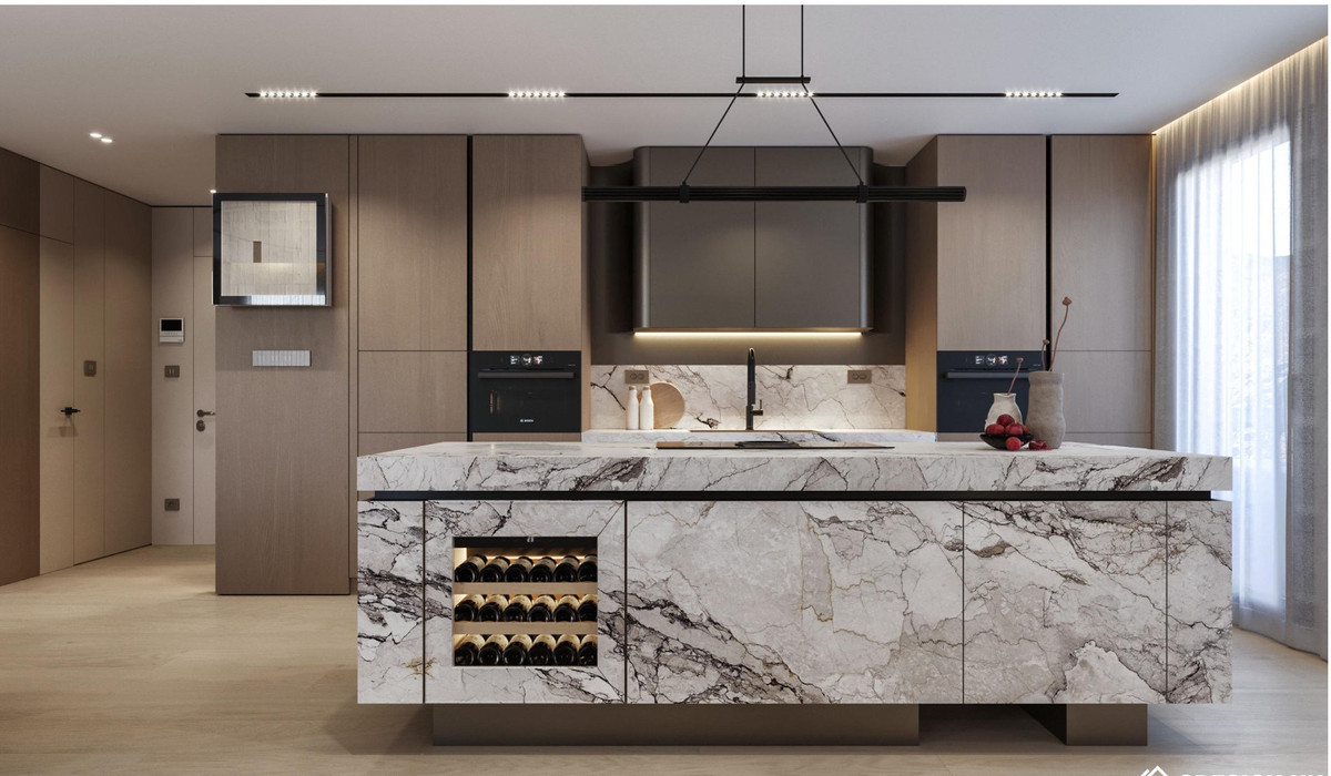 Inside, the 70 m² open-plan living, dining, and kitchen area welcomes abundant natural light, creating an atmosphere of spacious elegance. The home includes three serene bedrooms and three beautifully appointed bathrooms, with the master suite offering a designer freestanding bathtub and wall-mounted rainfall shower. Every detail reflects craftsmanship and harmony: Arklam stone countertops, a statement kitchen island, Miele premium appliances, and a built-in wine cooler complement Austrian-made furniture boards and tailor-made storage solutions. Warm Belgian flooring and Hansgrohe brushed bronze fittings add understated sophistication, while motorised curtain rails and shutters bring effortless comfort.