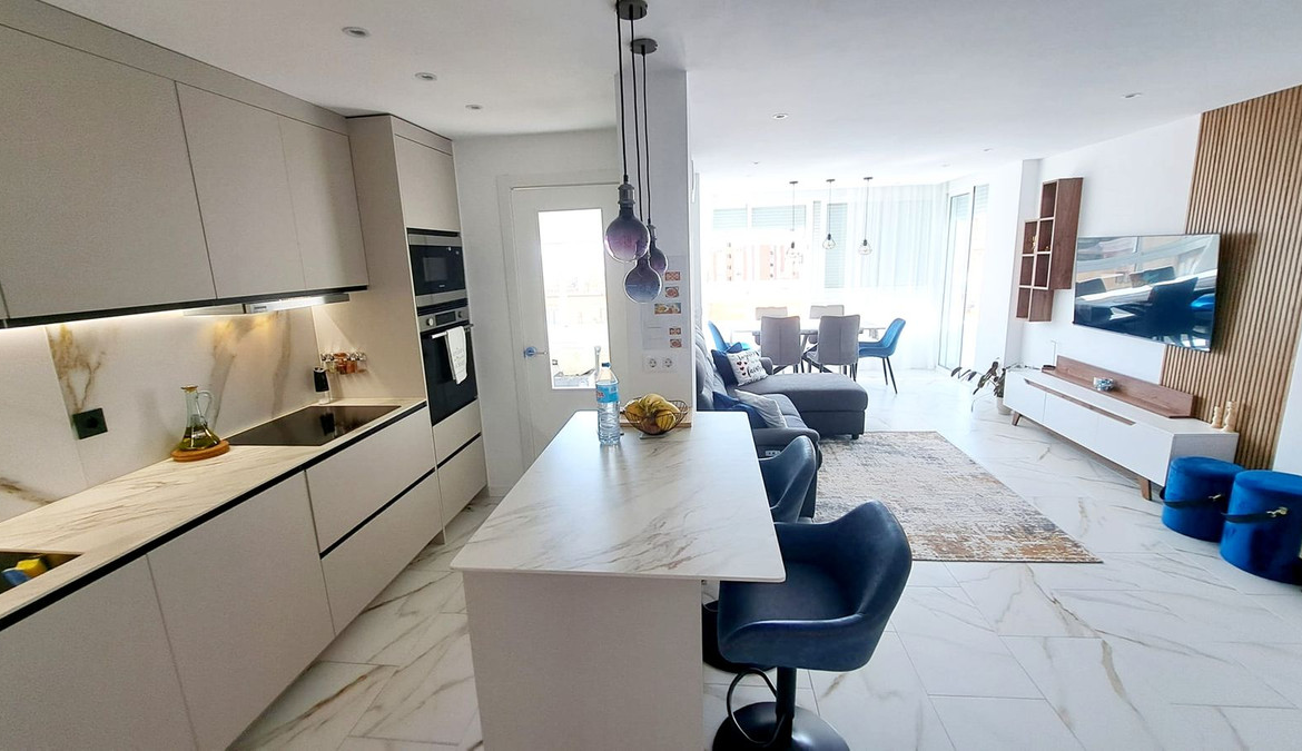 Top-quality apartment for sale in Fuengirola, offering a modern open-plan design and high-end finishes throughout. This spacious and bright property has been completely refurbished, including new plumbing, electrics, and pre-installation for a home automation system.