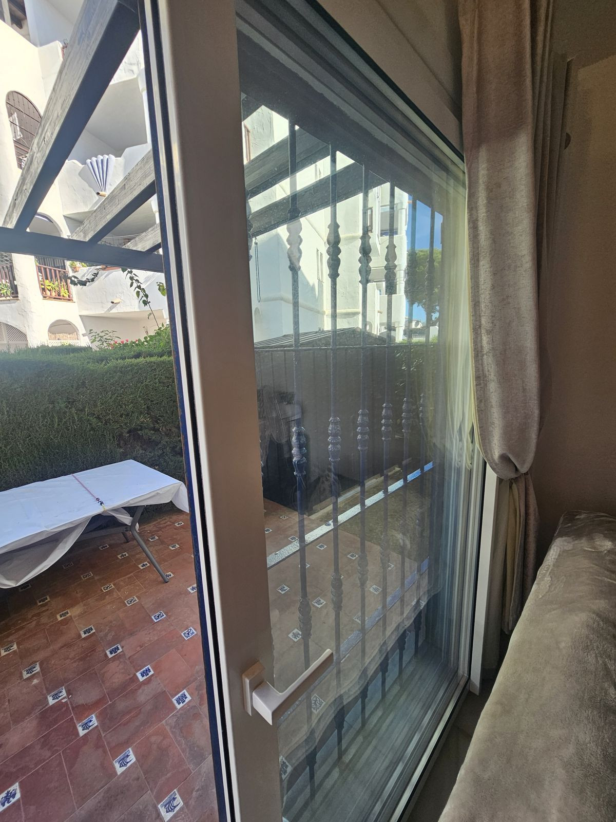 This recently renovated 2 bed 2 bath apartment has both a large terrace and private garden offering afternoon sun. All the windows, air conditioning, bathrooms and beds were renewed 3 months ago. Both bedrooms and the lounge have patio doors opening on to the garden and terrace. This apartment is set in a gated complex and there is also a communal pool and well-kept gardens.