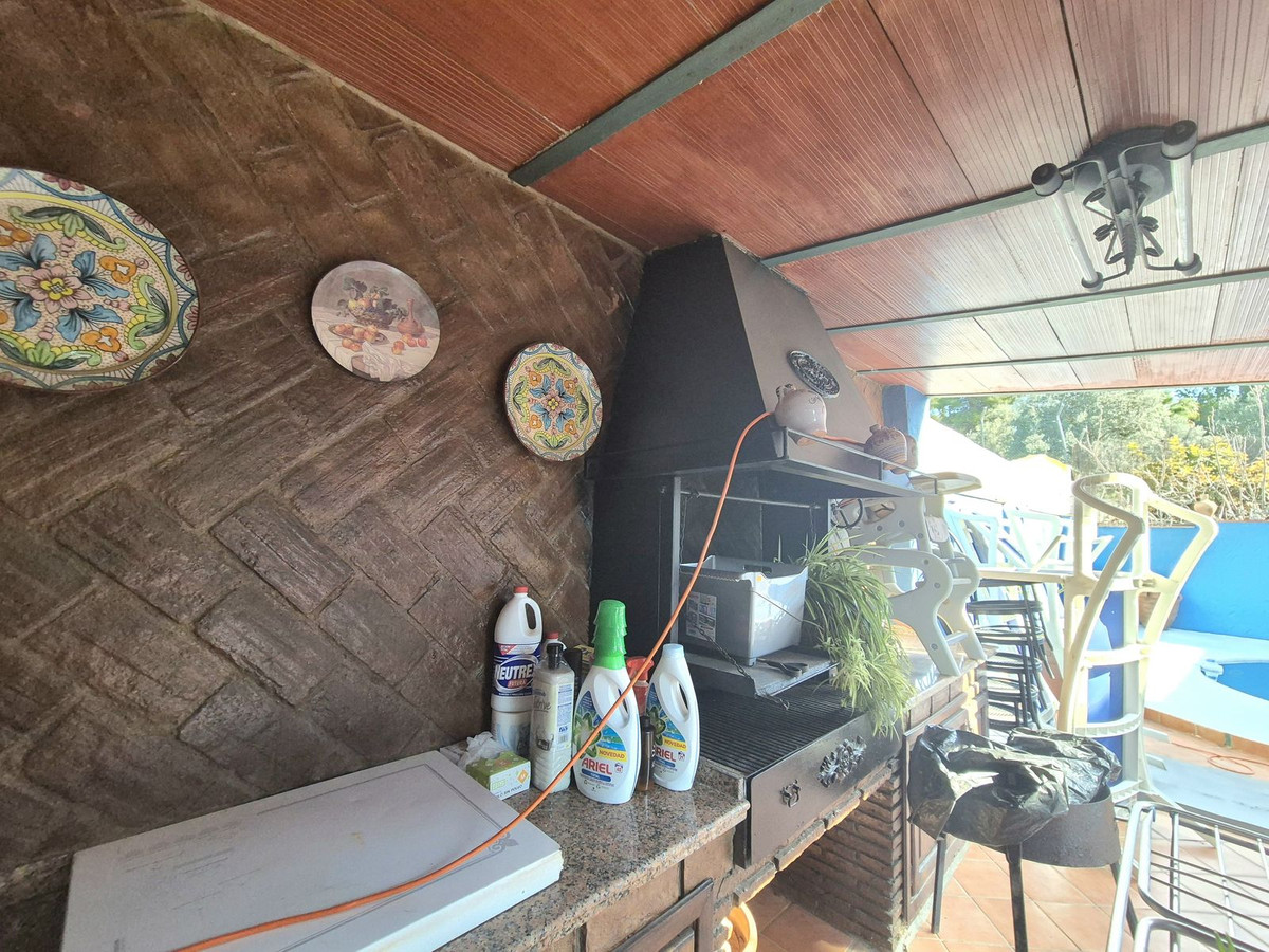 A good concrete road to arrive at the property with a large 2 car garage with storage space. Via a few steps you go up to the main entrance of the house where you will find a lovely sunny terrace with awnings that cover the whole area with pretty views to the town of Alhaurin el Grande, mountains and surrounds. Going into the property, you have to your left a downstairs toilet and under the stairs storage, and the open large living / dining room is to your right with a semi open fully fitted kitchen. The property has several nice features like a large wood burning fireplace, spanish style and air conditioning hot and cold. From here you can access by patio doors the back of the property. Also on the first floor is a large bedroom with ensuite bathroom with shower.