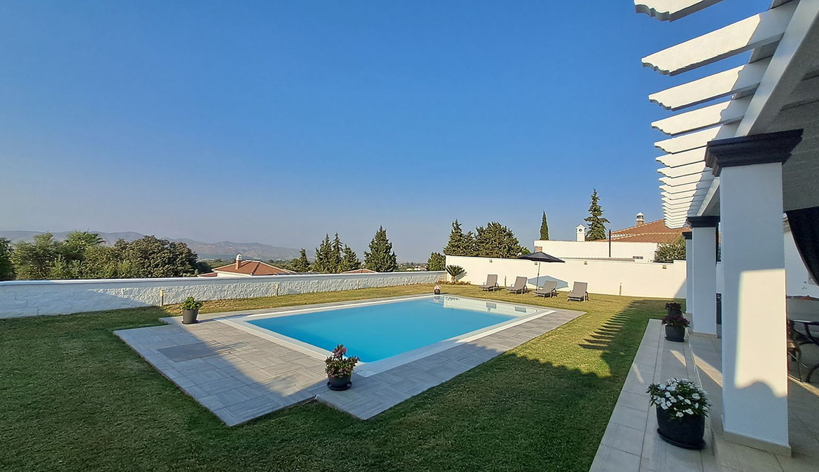 From the covered terrace, you have access to the beautifully maintained garden with a 50m² swimming pool, outdoor kitchen, bar, shower room, etc., where you can enjoy the impressive panorama of the surrounding countryside and mountains all the way to the bay of Malaga in complete tranquillity.
