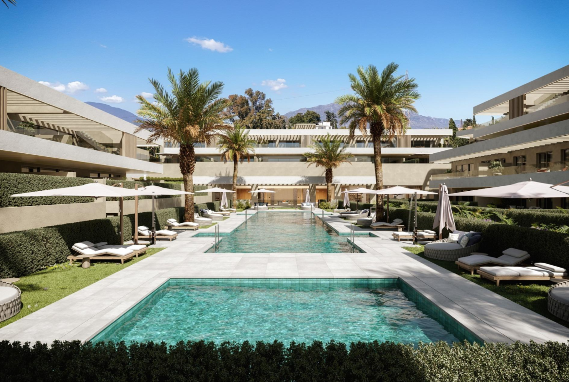 New Build Luxury Apartments in El Campanario-Estepona Near Golf and Beach Prime Location on the New Golden Mile This exclusive new development of 86 modern apartments is located in El Campanario, one of the most established and sought after residential areas of Estepona. Positioned on the prestigious New Golden Mile, the complex offers the perfect balance between privacy, green surroundings and proximity to the coast, just 1.8 km from the beach. El Campanario is known for its peaceful atmosphere, tree lined streets and flat terrain, ideal for walking and cycling. The area enjoys excellent year round weather and quick access to Marbella and Puerto Banus, making it a preferred choice for both permanent living and second homes on the Costa del Sol. Contemporary Apartments with Spacious Terraces The project offers 1, 2 and 3 bedroom apartments distributed across several low rise blocks. Buyers can choose between ground floor units with private gardens, middle floor apartments with generous terraces or penthouses with private terrace and solarium. Many homes also feature private swimming pools for an added level of exclusivity. Each apartment has been designed with open plan layouts that connect living areas seamlessly with outdoor spaces. Large format flooring and floor to ceiling windows maximize natural light and enhance the Mediterranean lifestyle. Exceptional Communal Areas and Wellness Facilities This residential complex redefines Mediterranean living through carefully designed communal spaces focused on relaxation and wellbeing. Landscaped gardens with fountains, water features and palm trees create a serene oasis atmosphere. Residents enjoy access to a Social Club with a fully equipped gym and outdoor yoga terrace, a complete wellness area with jacuzzi, steam sauna and dry sauna, and a heated swimming pool of more than 30 meters. The development also includes coworking spaces and social areas designed to combine productivity and leisure in a harmonious setting. High Quality Specifications and Design The apartments feature contemporary architecture with premium finishes and fully equipped integrated kitchens. Generous terraces extend the interior spaces outdoors, ideal for enjoying the Costa del Sol climate. The area is renowned for golf, including El Campanario Golf and Country Club, as well as nearby courses such as Atalaya Golf and Guadalmina Golf. Distances to Key Points of Interest Beach 1.8 km Puerto Banus 10 km Marbella 15 km Estepona center 12 km Malaga Airport 65 km Secure Your Mediterranean Home in El Campanario This outstanding new build development offers modern design, luxury amenities and an unbeatable location on the New Golden Mile. Contact us today to receive more information and reserve your new apartment in El Campanario-Estepona. 802