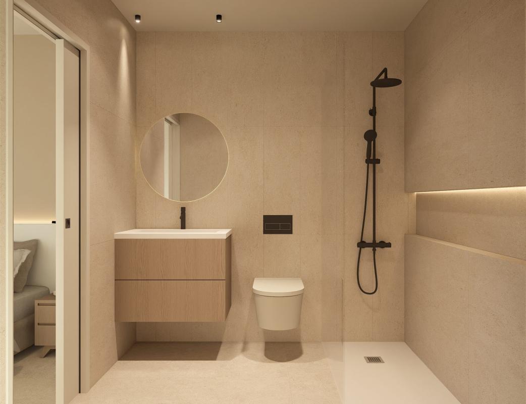 The bathrooms stand out for their contemporary and functional design, equipped with hanging units with mirror and integrated lighting. Sanitary ware is from a recognised brand or similar, with wall-mounted toilet and soft-close seat.