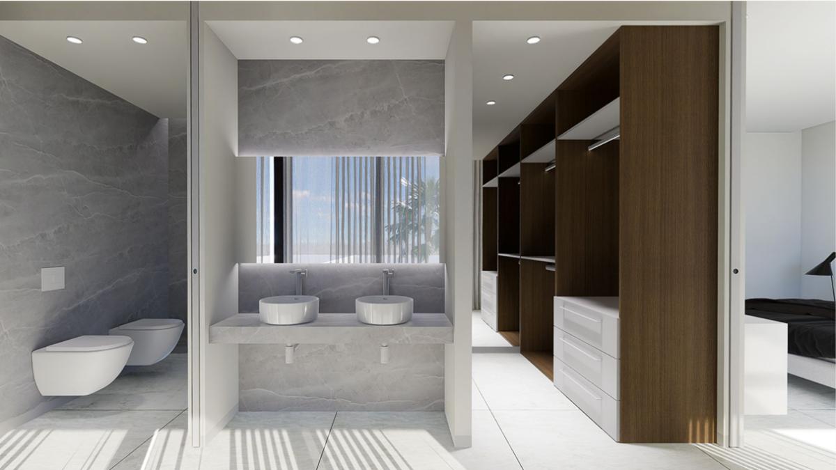 The installations are top-tier: advanced electrical systems with TV and data points, recessed LED lighting, and home automation with digital video entry. Climate control is assured through a heating and cooling pump and an aerothermal system for hot water. Outside, the carefully landscaped private garden with natural grass, automatic irrigation, and a private pool complements a modern Mediterranean environment. Rooftop photovoltaic solar systems reduce energy costs, making these homes an efficient and sustainable investment.
