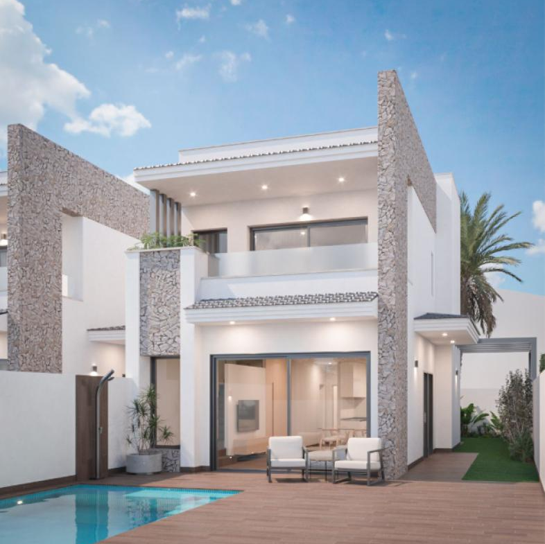Discover luxury and comfort in these exclusive villas featuring a private swimming pool and solarium, located in San Pedro del Pinatar. These properties, designed with a contemporary style and high-quality finishes, offer all the comfort you expect from new construction. Situated in one of the most sought-after areas of the city, the villas provide the perfect balance between privacy, elegance, and proximity to all amenities. Just 1.5 km from the beach and surrounded by parks, sports facilities, and renowned golf courses, they are ideal for those seeking a peaceful seaside lifestyle.